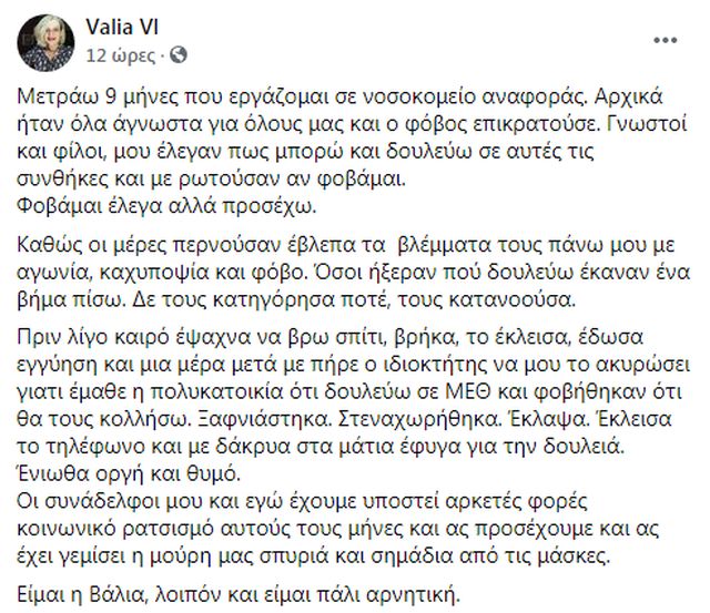 »Ένιωθα οργή και θυμό», γράφει σε ανάρτησή της στο Facebook η νοσηλεύτρια στο «Σωτηρία».