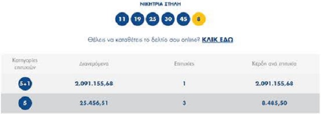 Έτσι, ο τυχερός παίκτης, που έπαιξε ΤΖΟΚΕΡ μέσω διαδικτύου, κέρδισε συνολικά 2.108.126 ευρώ.