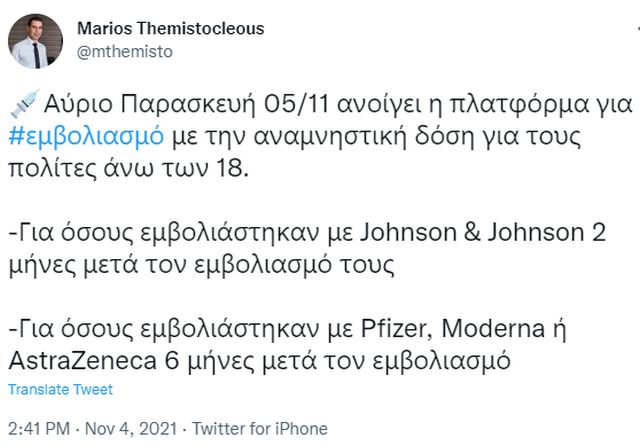 Ο κ. Θεμιστοκλέους, στην ανάρτησή του στο twitter για την 3η δόση επαναλαμβάνει ότι την Παρασκευή 5/11/2021 τίθεται σε λειτουργία η πλατφόρμα για τους άνω των 18.