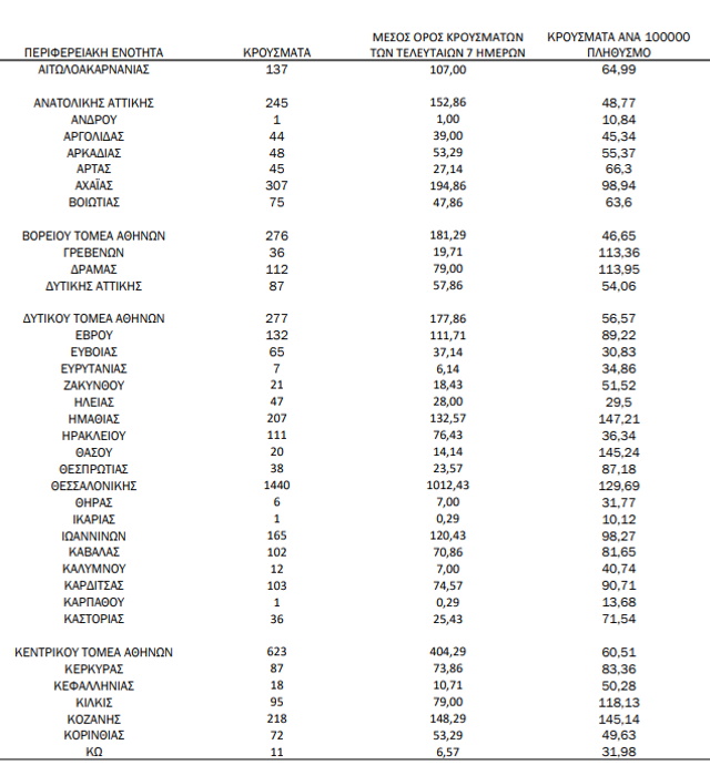 Την ίδια στιγμή, 19 περιοχές καταγράφουν τριψήφιο αριθμό κρουσμάτων.