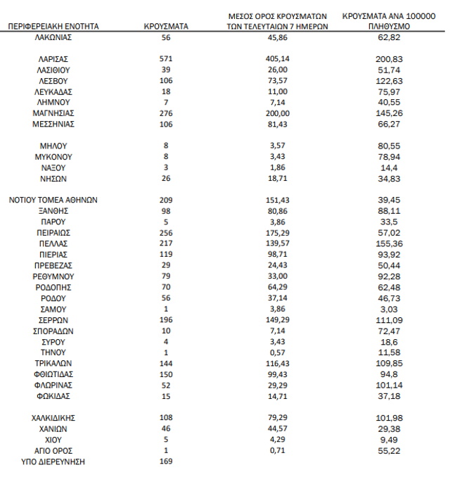 Στο «κόκκινο» παραμένουν η Λάρισα με 571, η Αχαΐα με 307 και η Μαγνησία με 276.