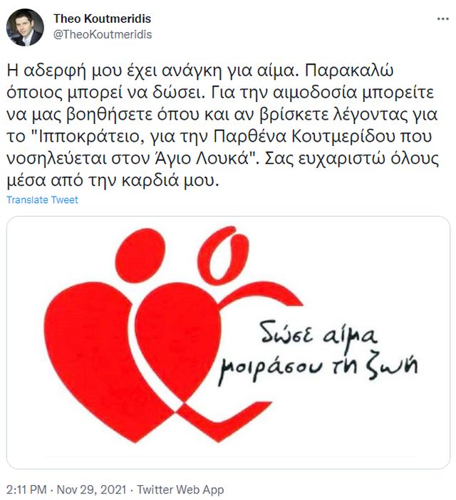 «Για την αιμοδοσία μπορείτε να μας βοηθήσετε όπου και αν βρίσκετε λέγοντας για το “Ιπποκράτειο, για την Παρθένα Κουτμερίδου που νοσηλεύεται στον Άγιο Λουκά”.