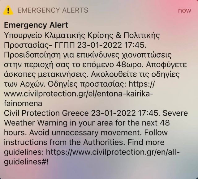 Το απόγευμα της Κυριακής, εστάλη μήνυμα του 112 σε κατοίκους του λεκανοπεδίου και της Εύβοιας, με την προειδοποίηση για επικίνδυνες χιονοπτώσεις το επόμενο 48ωρο.