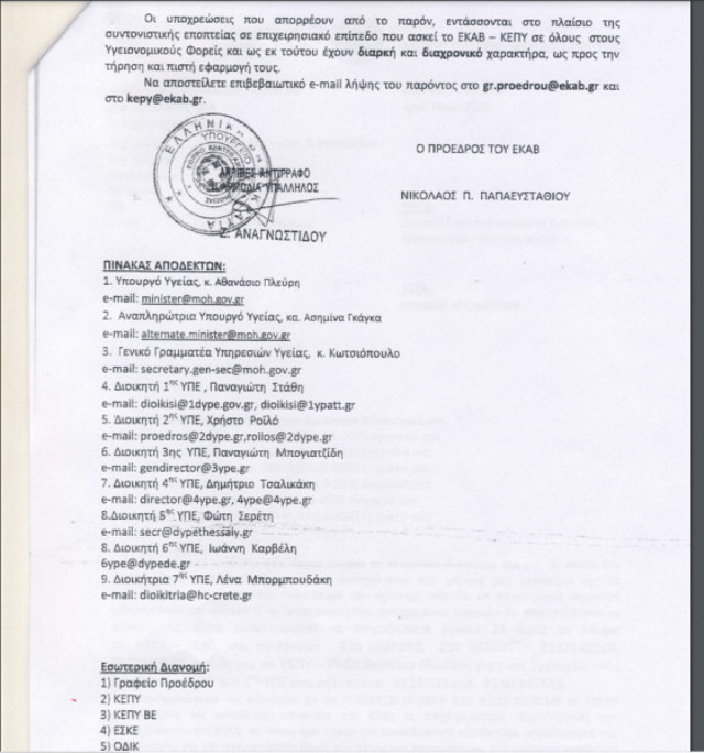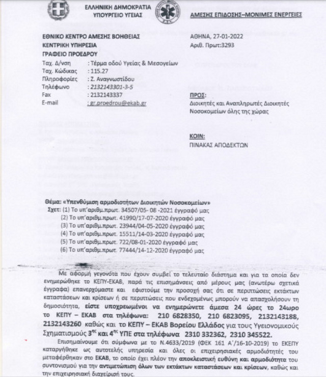 «Στο έγγραφο προς τους Διοικητές εφιστούν την προσοχή τους ότι σε περιπτώσεις εκτάκτων καταστάσεων και κρίσεων ή σε περιπτώσεις που ενδεχομένως μπορούν να απασχολήσουν τη δημοσιότητα (αυτό τους νοιάζει!!!) ότι είναι υποχρεωμένοι να ενημερώνουν άμεσα 24 ώρες το 24ωρο το ΚΕΠΥ – ΕΚΑΒ που έχει τον επιχειρησιακό συντονισμό.