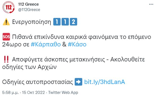 Λίγο μετά τις 18.00 το 112 απέστειλε έκτακτο μήνυμα στους κατοίκους της Καρπάθου και της Κάσου, ενημερώνοντάς τους για τα έντονα φαινόμενα που θα πλήξουν την περιοχή τους.