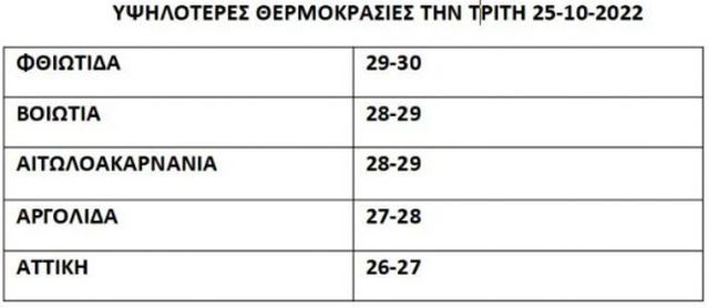 Όπως σημειώνει «στη χώρα μας δεν αποκλείεται να αγγίξουμε και τους 30 βαθμούς Κελσίου! Συγκεκριμένα από την Τρίτη 25/10/2022 μέχρι και το τριήμερο της 28ης Οκτωβρίου θα σημειωθούν πολύ υψηλές θερμοκρασίες».