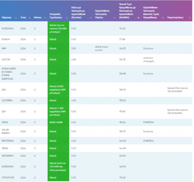 Όπως προκύπτει από τον σχετικό κατάλογο πλέον υπάρχει στην αγορά μια χαμηλή τιμή 0,11 λεπτά η οποία όμως αφορά μόνο στις πρώτες 100 κιλοβατώρες της κατανάλωσης.