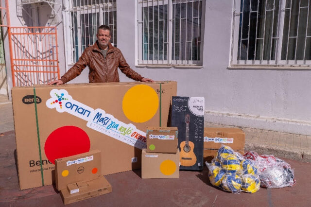 Γιάννης Χατζής, συνεργάτης δικτύου ΟΠΑΠ με τα είδη δωρεάς για το 1ο Δημοτικό Σχολείο Μοσχάτου