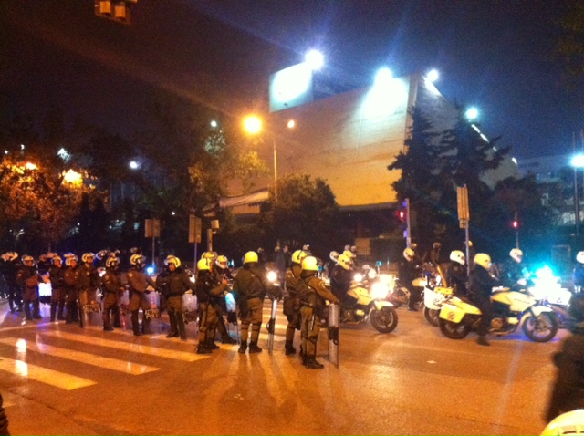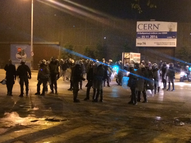 Συντονισμένη επιχείρηση της αστυνομίας, με άνδρες των ΜΑΤ και δικυκλιστές της ομάδας Ζ, πραγματοποιήθηκε λίγο πριν τις 23:00 στην οδό Εγνατία, για την απομάκρυνση των κουκουλοφόρων που πετούσαν αντικείμενα στη Βόρεια Πύλη της Διεθνούς Εκθέσεως.