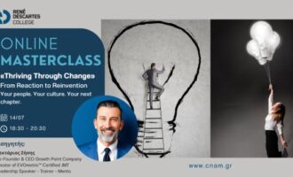 Το Κολλέγιο René Descartes διοργανώνει ένα δωρεάν online Masterclass με τίτλο «Thriving Through Change», τη Δευτέρα 14 Ιουλίου 2025, ανοιχτό στο ευρύ κοινό.