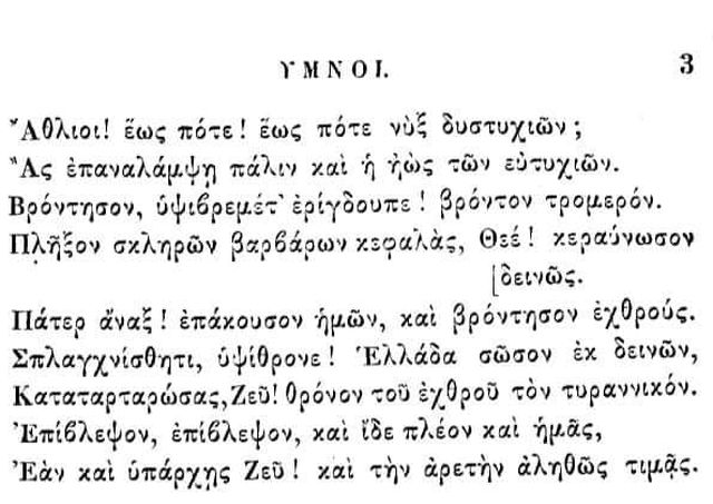 Στην εικόνα ένα μικρό απόσπασμα εθνικού επαναστατικού ύμνου, ο οποίος εκτυπώθηκε στον Μοριά τον Μάρτιο του 1821 και κυκλοφόρησε υπό τον τίτλο «Ωδή Πολεμιστήριος».