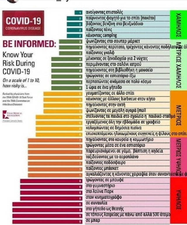 Ειδικότερα, παρουσιάζει έναν πίνακα ταξινόμησης καθημερινών δραστηριοτήτων, που περιλαμβάνουν μεταξύ άλλων την άθληση, το σούπερ μάρκετ, τα ταξίδια με αεροπλάνο, επισκέψεις σε μπαρ, χώρους λατρείας, με βάση την επικινδυνότητα τους, ανάλογα δηλαδή με το πόσο εύκολο είναι να μολυνθεί καποιος κάνοντας κάτι από αυτές.