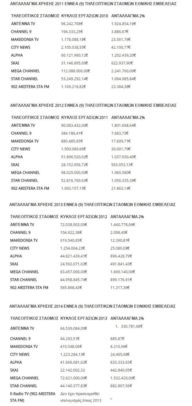Παρακάτω παρατίθενται οι πίνακες που συνέταξε η αρμόδια γενική γραμματεία ενημέρωσης. Σημειώνεται πάντως πως υπάρχουν σταθμοί, όπως το MEGA, που πληρώνουν για τέλη συχνότητων, όπως αναφέρει στον ισολογισμό.