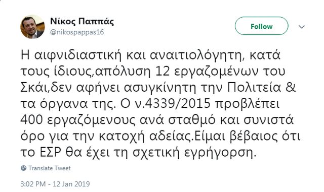 «Η αιφνιδιαστική και αναιτιολόγητη, κατά τους ίδιους, απόλυση 12 εργαζομένων του Σκάι, δεν αφήνει ασυγκίνητη την Πολιτεία & τα όργανα της.