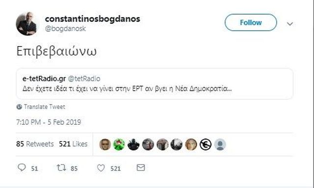 Με ένα ποστ στο twitter, ο Μπογδάνος παρακινεί τον κόσμο να ψηφίσει Νέα Δημοκρατία και υπόσχεται να γκρεμίσει το ραδιομέγαρο με τανκς.