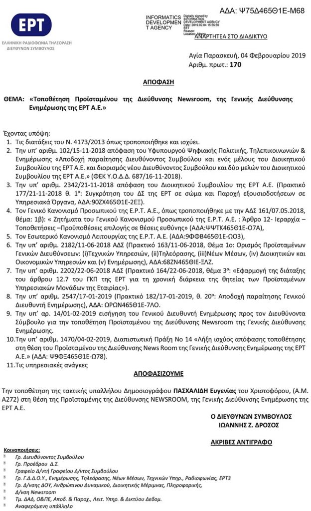 Για την ακρίβεια, η κυρία Πασχαλίδη αναλαμβάνει προϊσταμένη της Διεύθυνσης Newsroom, της Γενικής Διεύθυνσης Ενημέρωσης της ΕΡΤ Α.Ε.