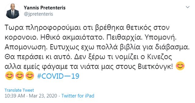 Με ένα μήνυμά του μέσω του προσωπικού του λογαριασμού στο Twitter ο γνωστός δημοσιογράφος Γιάννης Πρετεντέρης έκανε γνωστό ότι βρέθηκε θετικός στο νέο κορονοϊό SARS-Cov-2.
