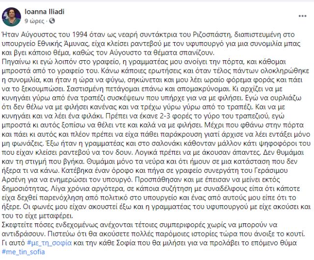 Με ανάρτησή της στον προσωπικό της λογαριασμό στο Facebook η δημοσιογράφος Ιωάννα Ηλιάδη αναφέρθηκε σε σεξουαλική επίθεση που δέχθηκε όταν ήταν νεαρή συντάκτρια στον Ριζοσπάστη, διαπιστευμένη στο υπουργείο Εθνικής Άμυνας.