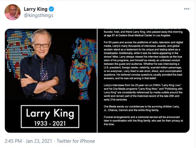 Πέθανε σε ηλικία 87 ετών ο θρύλος των talk shows Λάρι Κινγκ (Larry King). Τη θλιβερή είδηση ανακοίνωσε η οικογένειά του.