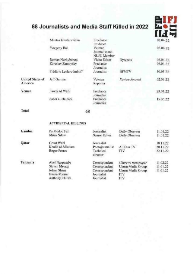 Ακολουθεί η λίστα της ΔΟΔ με τους δημοσιογράφους που δολοφονήθηκαν το 2022: