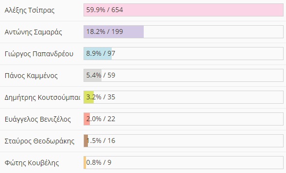 Στη ψηφοφορία πήραν μέρος 1,091 αναγνώστες. Δείτε σε πίνακα τα ποσοστά και τις ψήφους που συγκέντρωσαν όλοι οι πολιτικοί αρχηγοί: