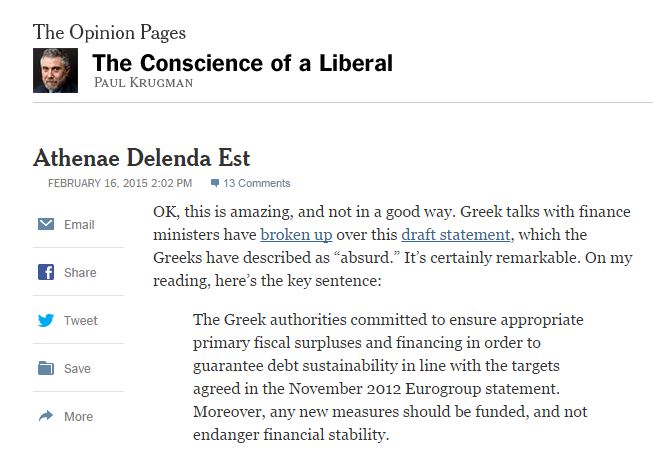 Ο κ. Κρούγκμαν , στο άρθρο του συμβολικό τίτλο στα λατινικά «η Αθήνα πρέπει να καταστραφεί», τονίζει ότι :