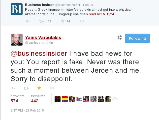 «Σας έχω άσχημα νέα. Το ρεπορτάζ σας είναι ψεύτικο. Ποτέ δεν υπήρξε τέτοια στιγμή ανάμεσα στον Γερούν και εμένα. Λυπάμαι που θα σας απογοητεύσω», έγραψε ο Γιάνης Βαρουφάκης αργά το βράδυ του Σαββάτου, απαντώντας στο tweet του Business Insider με το σχετικό ρεπορτάζ.