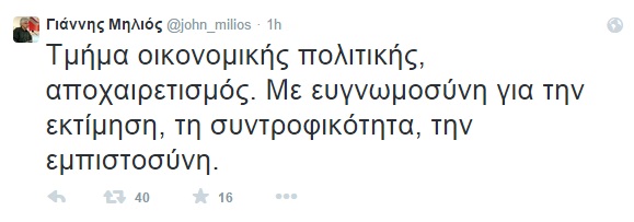 «Τμήμα οικονομικής πολιτικής, αποχαιρετισμός. Με ευγνωμοσύνη για την εκτίμηση, την συντροφικότητα, την εμπιστοσύνη», έγραψε στο Twitter.