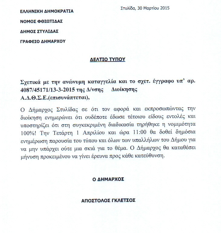 Ο δήμαρχος Στυλίδας Απόστολος Γκλέτσος απάντησε με προσφυγή στη Δικαιοσύνη μετά την ανώνυμη καταγγελία υπαλλήλου -υπαρκτού ή όχι- του Δήμου που κοινοποιείται σε υπουργούς και άλλους παράγοντες του δημόσιου βίου, όχι όμως στην Δικαιοσύνη, που αναφέρει βιομηχανία έμμεσων αναθέσεων στις προμήθειες του Δήμου