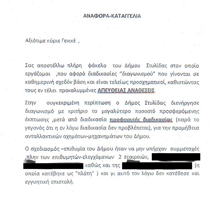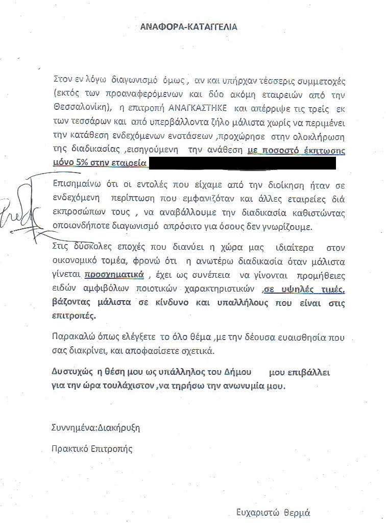 Ο καταγγέλλων αναφέρει ότι σε καθημερινή βάση γίνονται προσχηματικοί διαγωνισμοί και επικαλείται σχετική διαδικασία για την προμήθεια ανταλλακτικών μηχανημάτων του Δήμου όπου «στήθηκε» ένας εικονικός διαγωνισμός προκειμένου με τη… συνδρομή και άλλων επαγγελματιών που κάνουν «πλάτη» να δοθεί η προμήθεια σε συγκεκριμένο έμπορο.