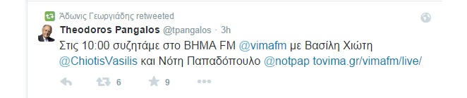 Στον απόηχο της κοινοβουλευτικής “μάχης” της Δευτέρας, ο κοινοβουλευτικός εκπρόσωπος της Νέας Δημοκρατίας αναπαρήγαγε το tweet του Θεόδωρου Πάγκαλου με το οποίο ανακοίνωνε τη ραδιοφωνική του παρέμβαση στο ΒΗΜΑ FM: