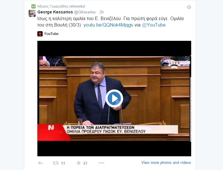 Στη συνέχεια ο Άδωνις Γεωργιάδης έκανε retweet σε έναν “ύμνο” στον Ευάγγελο Βενιζέλο: