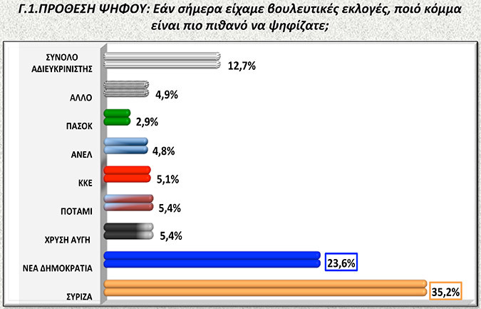 Σαρώνει ο ΣΥΡΙΖΑ, αφού προηγείται κατά 11, 5 μονάδες της Νέας Δημοκρατίας σε δημοσκόπηση της εταιρείας Metrisi, η οποία πραγματοποιήθηκε στο διάστημα 31 Μαρτίου έως 2 Απριλίου. Το κόμμα της Κουμουνδούρου συγκεντρώνει ποσοστό 35,2% έναντι 23,6% της ΝΔ.