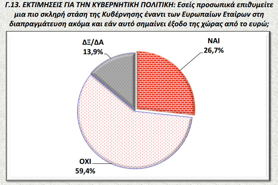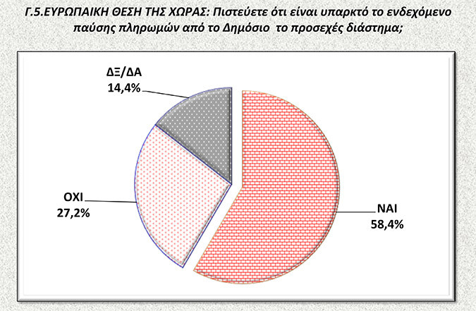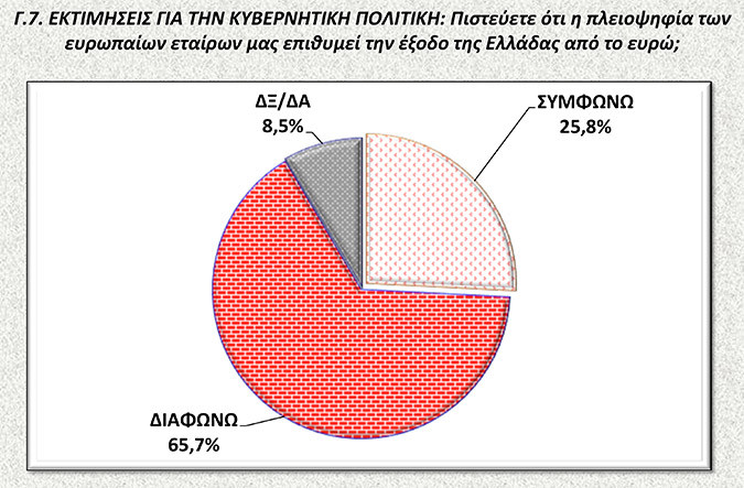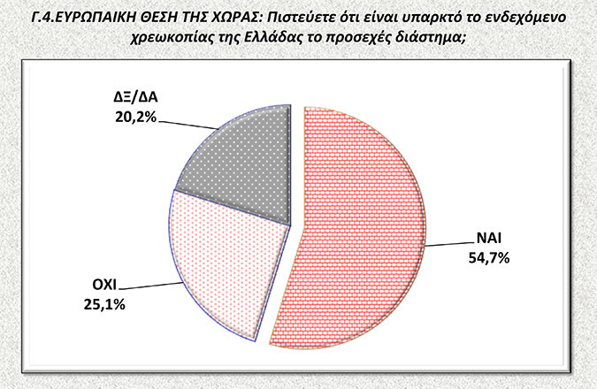 Στην έρευνα που πραγματοποιήθηκε για λογαριασμό του ιστότοπου «ΠΡΩΤΟ ΘΕΜΑ» περίπου οι μισοί Ελληνες θεωρούν ορατό το ενδεχόμενο χρεοκοπίας το επόμενο διάστημα, αλλά και έξοδο της Ελλάδας από το ευρώ.