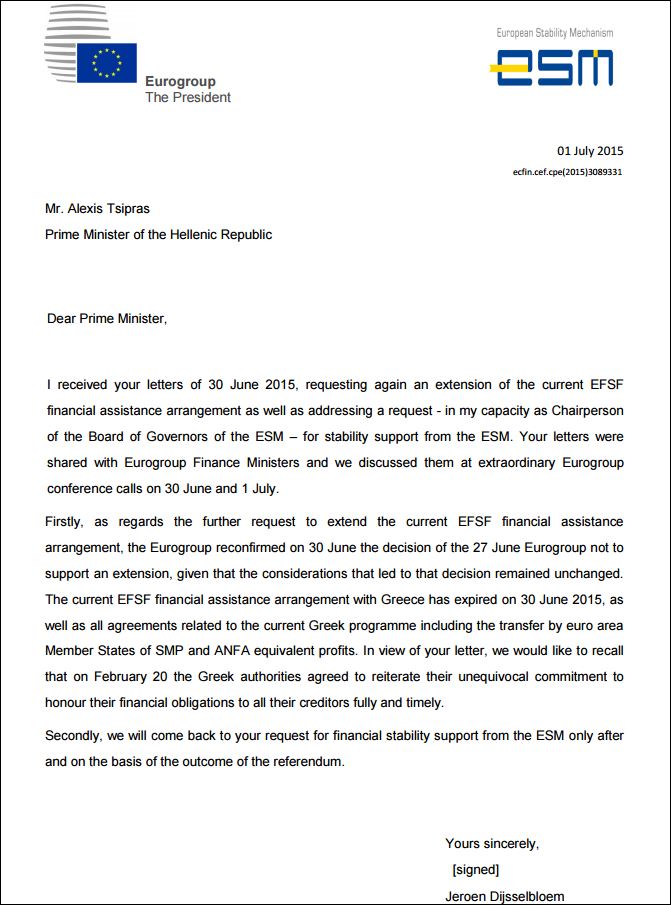 Κύριε Πρωθυπουργέ, έλαβα τις επιστολές σας της 30ης Ιουνίου 2015, όπου ζητούσατε εκ νέου παράταση της τρέχουσας συμφωνίας χρηματοοικονομικής βοήθειας του EFSF, καθώς μου απευθύνατε αίτημα – υπό την ιδιότητά μου ως Προέδρου του Διοικητικού Συμβουλίου του ESM- για στήριξη χρηματοπιστωτικής σταθερότητας από τον ESM.
