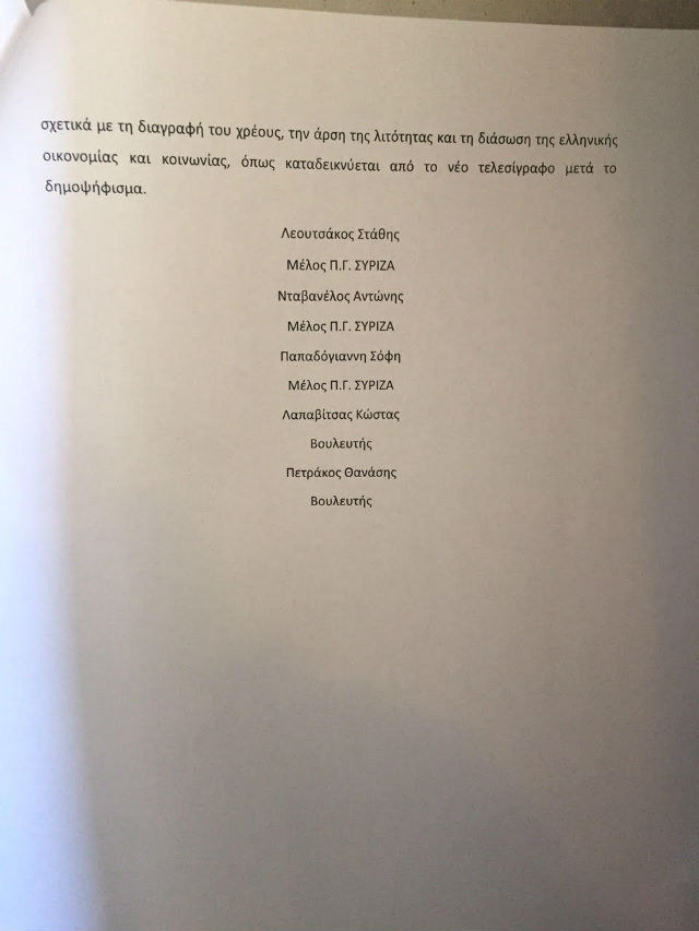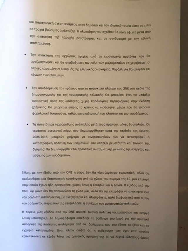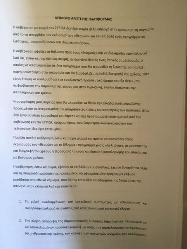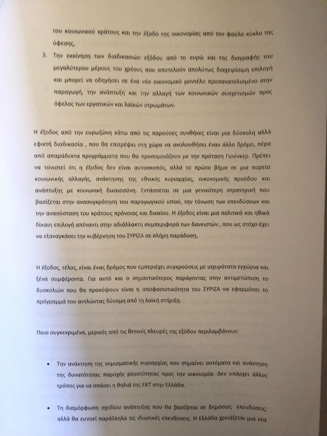«Παρ’ όλα αυτά, η κυβέρνηση έστω και τώρα μπορεί και πρέπει να απαντήσει στους εκβιασμούς των θεσμών με το δίλημμα πρόγραμμα χωρίς νέα λιτότητα με ρευστότητα και διαγραφή του χρέους ή έξοδος από το ευρώ και διακοπή αποπληρωμής του άδικου και μη βιώσιμου χρέους» αναφέρεται στο κείμενο.