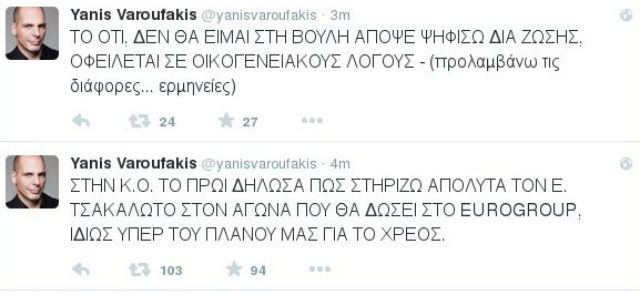 Ο Γιάνης Βαρουφάκης φρόντισε μάλιστα να ενημερώσει μέσω Twitter ότι δεν θα παραστεί στην πιο κρίσιμη ψηφοφορία για τη χώρα για οικογενειακούς λόγους και αυτή η απουσία του δεν θα πρέπει να ληφθεί ως μη στήριξη στον Αλέξη Τσίπρα και στον Ευκλείδη Τσακαλώτο.