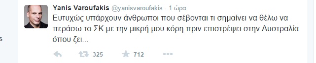 Ο Γιάνης Βαρουφάκης έγραψε για την απαράδεκτη και πολιτικά ανήθικη συμπεριφορά του στο Twitter: “Ευτυχώς υπάρχουν άνθρωποι που σέβονται τι σημαίνει να θέλω να περάσω το ΣΚ με την μικρή μου κόρη πριν επιστρέψει στην Αυστραλία όπου ζει…”.