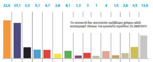 Στην δημοσκόπηση της Alco για το “Πρώτο Θέμα”, που δημοσιεύθηκε σήμερα, όπως δείχνουν τα ευρήματα ο ΣΥΡΙΖΑ καταλαμβάνει την πρώτη θέση με 22,6% έναντι 22,1% της δεύτερης Ν.Δ.. Ακολουθούν η Χ.Α. με 6,3%, το Ποτάμι με 5,1%, το ΚΚΕ με 4,7% το ΠΑΣΟΚ με 4,1%, η Λαϊκή Ενότητα 4%, και η Ένωση Κεντρώων 3%. Εκτός Βουλής φαίνεται να μένουν οι ΑΝΕΛ με ποσοστό 2,4%. Στο 13,6% οι αναποφάσιστοι.