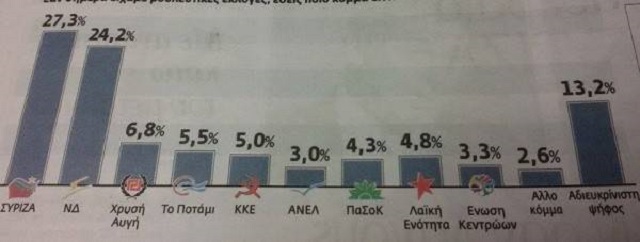 Στη δημοσκόπηση της Κάπα Research για το “ΒΗΜΑ” της Κυριακής, η διαφορά αποτυπώνεται στις 3,1 μονάδες με το ΣΥΡΙΖΑ να προηγείται με 27,3% και τη ΝΔ να ακολουθεί με 24,2%. Τρίτο κόμμα είναι η Χρυσή Αυγή με 6,8% κι ακολουθούν το Ποτάμι με 5,5, το ΚΚΕ με 5%, η Λαϊκή Ενότητα με 4,8%, το ΠΑΣΟΚ με 4,3%, η Ένωση Κεντρώων με 3,3% και οι ΑΝΕΛ με 3%. Η αδιευκρίνιστη ψήφος υπολογίζεται στο 13,2%.