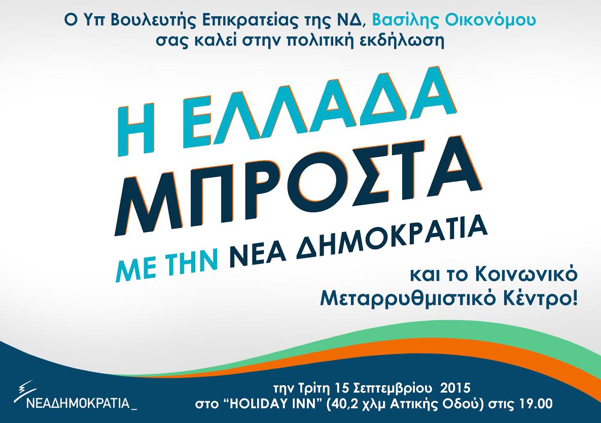 Συγκεκριμένα, ο Βασίλης Οικονόμου καλεί την Τρίτη 15 Σεπτεμβρίου στο ξενοδοχείο Holiday Inn, στην Αττική Οδό, στις 19.00 με σύνθημα “Η Ελλάδα Μπροστά με τη Νέα Δημοκρατία και το Κοινωνικό Μεταρρυθμιστικό Κέντρο”.