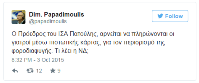 Συγκεκριμένα ο κ. Παπαδημούλης έγραψε: Ο Πρόεδρος του ΙΣΑ Πατούλης, αρνείται να πληρώνονται οι γιατροί μέσω πιστωτικής κάρτας, για τον περιορισμό της φοροδιαφυγής. Τι λέει η ΝΔ; »