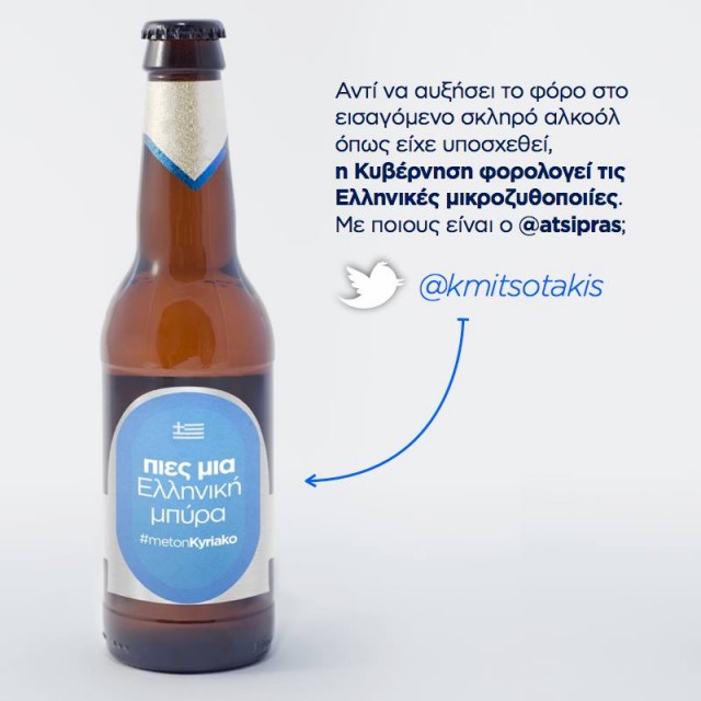 “Αντί να αυξήσει το φόρο στο εισαγόμενο σκληρό αλκοόλ όπως έχω προτείνει, η Κυβ. φορολογεί την ελληνική μπύρα. Με ποιους είναι ο @atsipras”, έγραψε ο Κυριάκος Μητσοτάκης, με εικονογράφηση του μηνύματος του ένα μπουκάλι ελληνική μπύρα.