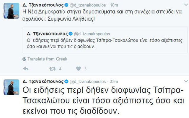 Οι ειδήσεις περί δήθεν διαφωνίας Τσίπρα-Τσακαλώτου είναι τόσο αξιόπιστες όσο και εκείνοι που τις διαδίδουν», σημειώνει ο Δημήτρης Τζανακόπουλος, με ανάρτησή του στο Twitter.