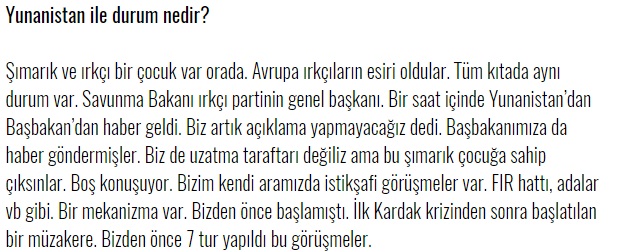 Şımarık ve ırkçı bir çocuk var orada. Avrupa ırkçıların esiri oldular. Tüm kıtada aynı durum var. Savunma Bakanı ırkçı partinin genel başkanı. Bir saat içinde Yunanistan’dan Başbakan’dan haber geldi. Biz artık açıklama yapmayacağız dedi. Başbakanımıza da haber göndermişler. Biz de uzatma taraftarı değiliz ama bu şımarık çocuğa sahip çıksınlar. Boş konuşuyor. Bizim kendi aramızda istikşafi görüşmeler var. FIR hattı, adalar vb gibi. Bir mekanizma var. Bizden önce başlamıştı. İlk Kardak krizinden sonra başlatılan bir müzakere. Bizden önce 7 tur yapıldı bu görüşmeler.