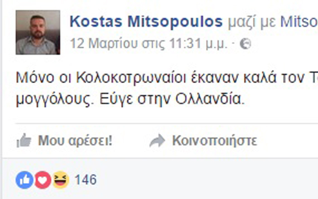 «Οι αναρτήσεις του Κωνσταντίνου Μητσόπουλου στα μέσα κοινωνικής δικτύωσης βρίθουν εμφυλιοπολεμικού μένους, ρατσισμού, ξενοφοβίας. Στο παραλήρημα αλυτρωτισμού, που τον διακατέχει, μάλιστα, φτάνει στο σημείο να εκφράζει την επιθυμία να «πάρουμε την Πόλη, την Σμύρνη», ακόμα και … «την Μεγάλη Ελλάδα».