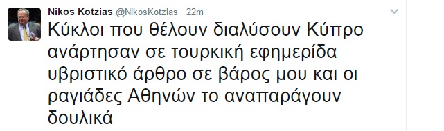 “Κύκλοι που θέλουν διαλύσουν [την] Κύπρο ανάρτησαν σε τουρκική εφημερίδα υβριστικό άρθρο σε βάρος μου και οι ραγιάδες [των] Αθηνών το αναπαράγουν δουλικά”.