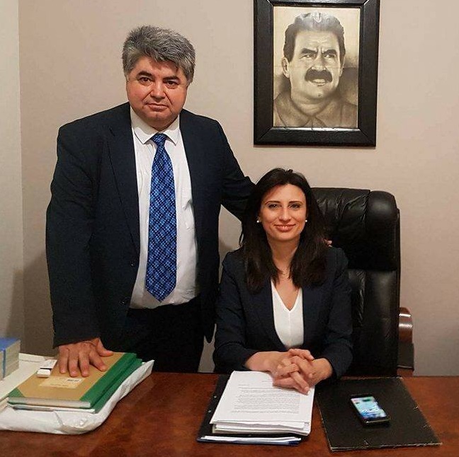Η Νίνα Κασιμάτη του ΣΥΡΙΖΑ με τον Ιεμπραχέμ Μουσλέμ υπό το πορτρέτο του Αμπντουλάχ Οτσαλάν.