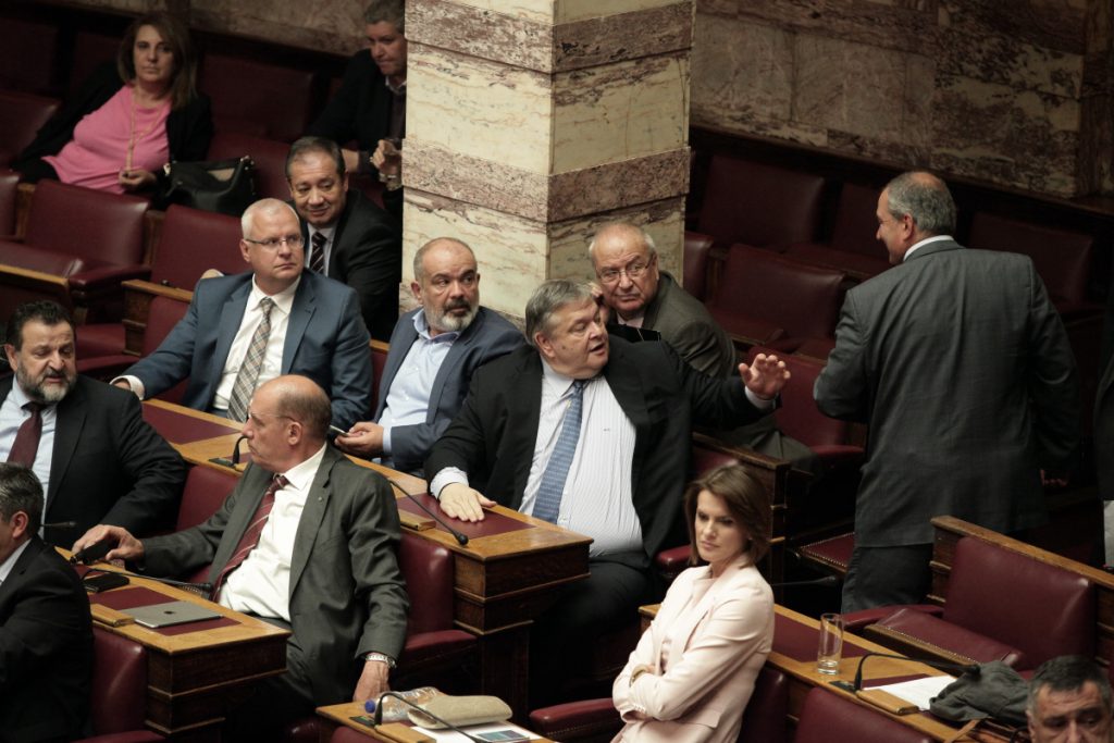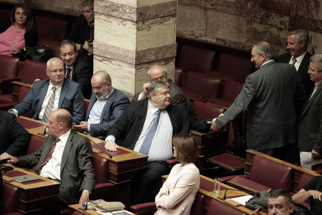 Την ώρα που ο Ευάγγελος Βενιζέλος παρακολουθούσε προσηλωμένος τη συζήτηση στη Βουλή, ο πρώην πρόεδρος της ΝΔ, Κώστας Καραμανλής, τον πλησίασε και του τσίμπησε το μάγουλο.