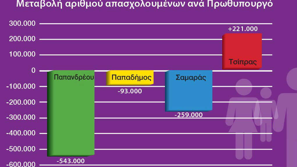 Αντίθετα, επί διακυβέρνησης Αλέξη Τσίπρα η απασχόληση αυξήθηκε κατά 221.000 θέσεις εργασίας.